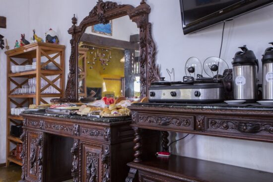 Quando nossos convidados podem desfrutar de suco de frutas da estação, pães, frios e deliciosos bolos na companhia de beija flores, sabiás, maritacas, tiê-sangue e outros passarinhos da mata atlântica. O salão de café da manhã é decorado com um conjunto de jantar do século XIX, onde a grande mesa proporciona aos convidados ótimos papos. As mesas da piscina também são uma ótima opção.